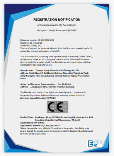 5月,廈門集慶生物研發(fā)的兩種猴痘病毒檢測(cè)試劑盒——核酸檢測(cè)(RT-LAMP)和抗原檢測(cè)(膠體金法)均獲得CE認(rèn)證。