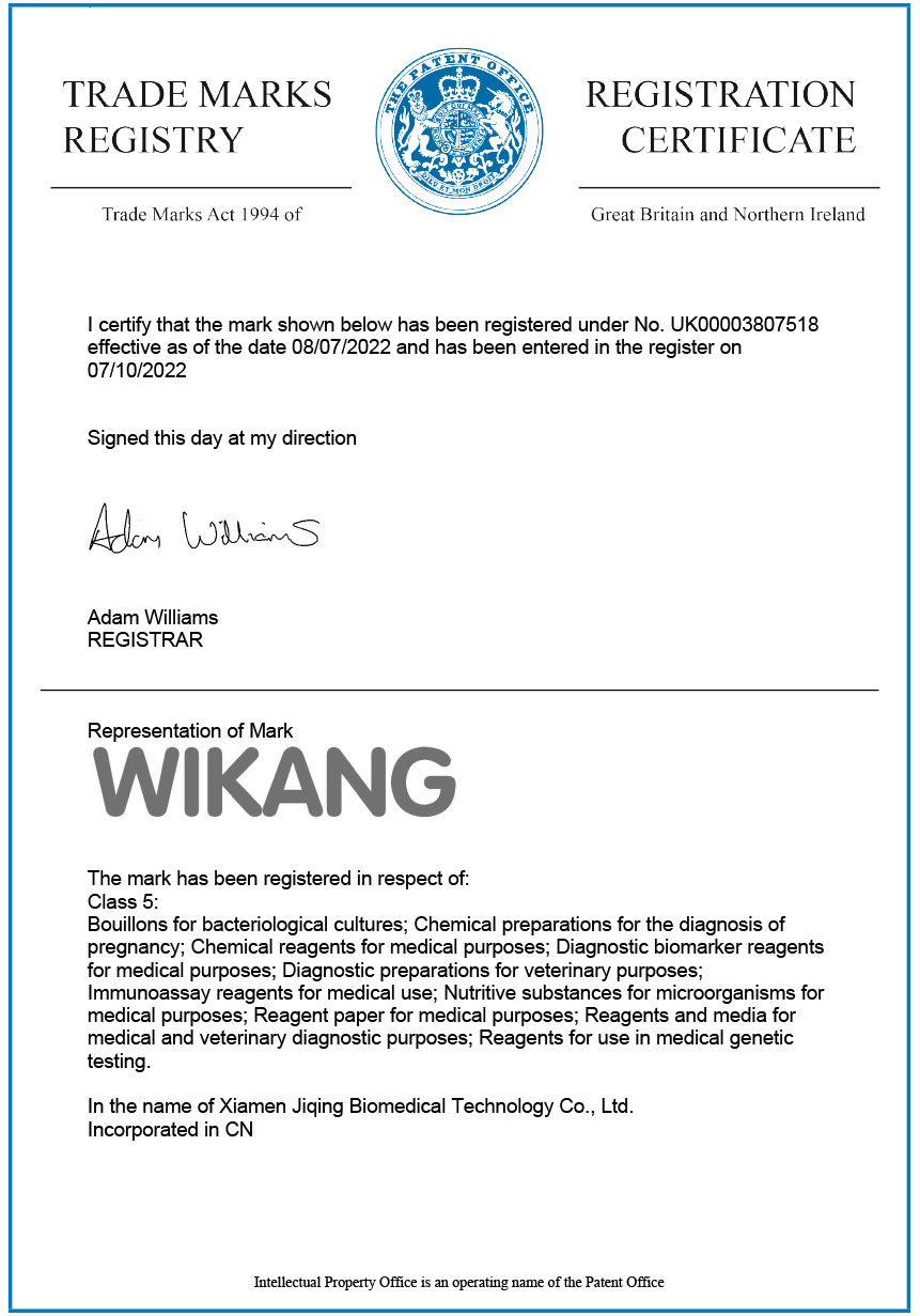 WIKANG 泰國、日本、英國、菲律賓國外商標(biāo)注冊(cè)資質(zhì) 5 項(xiàng)