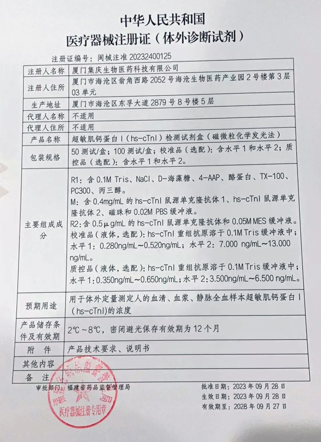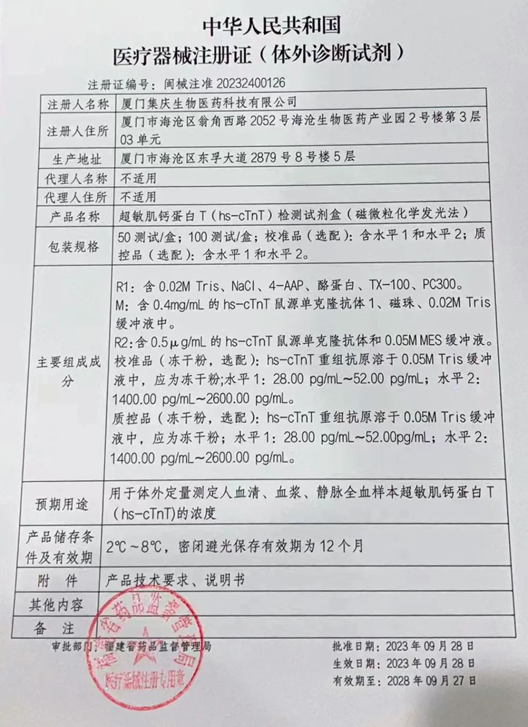 近日,集慶生物自主研發(fā)的超敏肌鈣蛋白I(hs-cTnI)檢測(cè)試劑盒(磁微粒化學(xué)發(fā)光法)、超敏肌鈣蛋白T(hs-cTnT)檢測(cè)試劑盒(磁微?;瘜W(xué)發(fā)光法),經(jīng)福建省藥品監(jiān)督管理局批準(zhǔn)獲得醫(yī)療器械注冊(cè)證,正式獲準(zhǔn)投入市場(chǎng)。詳細(xì)信息如下: