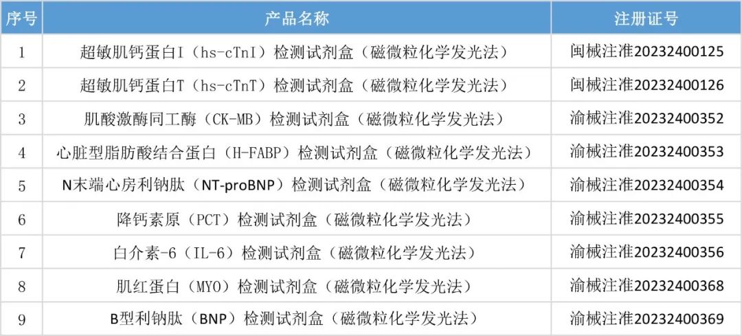 本次獲證產(chǎn)品共9款。其中心肌類包括:肌紅蛋白(MYO)、超敏肌鈣蛋白I(hs-cTnI)、超敏肌鈣蛋白T(hs-cTnT)、肌酸激酶同工酶(CK-MB)、B型利鈉肽(BNP)、N末端心房利鈉肽(NT-proBNP)和心臟型脂肪酸結(jié)合蛋白(H-FABP)檢測(cè)項(xiàng)目,能夠從多角度、多方位對(duì)心肌損傷、心肌梗死、心肌炎和心力衰竭等疾病進(jìn)行快速有效的診斷。炎癥類包括:降鈣素原(PCT)和白介素-6(IL-6)檢測(cè)項(xiàng)目,可提高對(duì)感染和膿毒癥的診斷效能,更精準(zhǔn)地指導(dǎo)抗生素的使用。