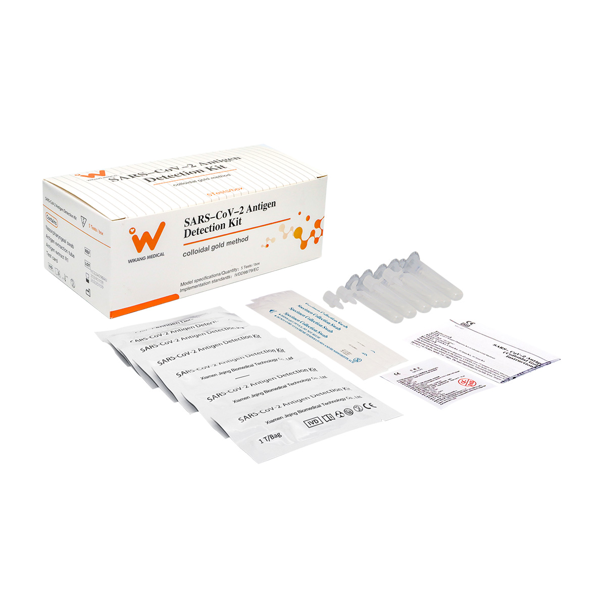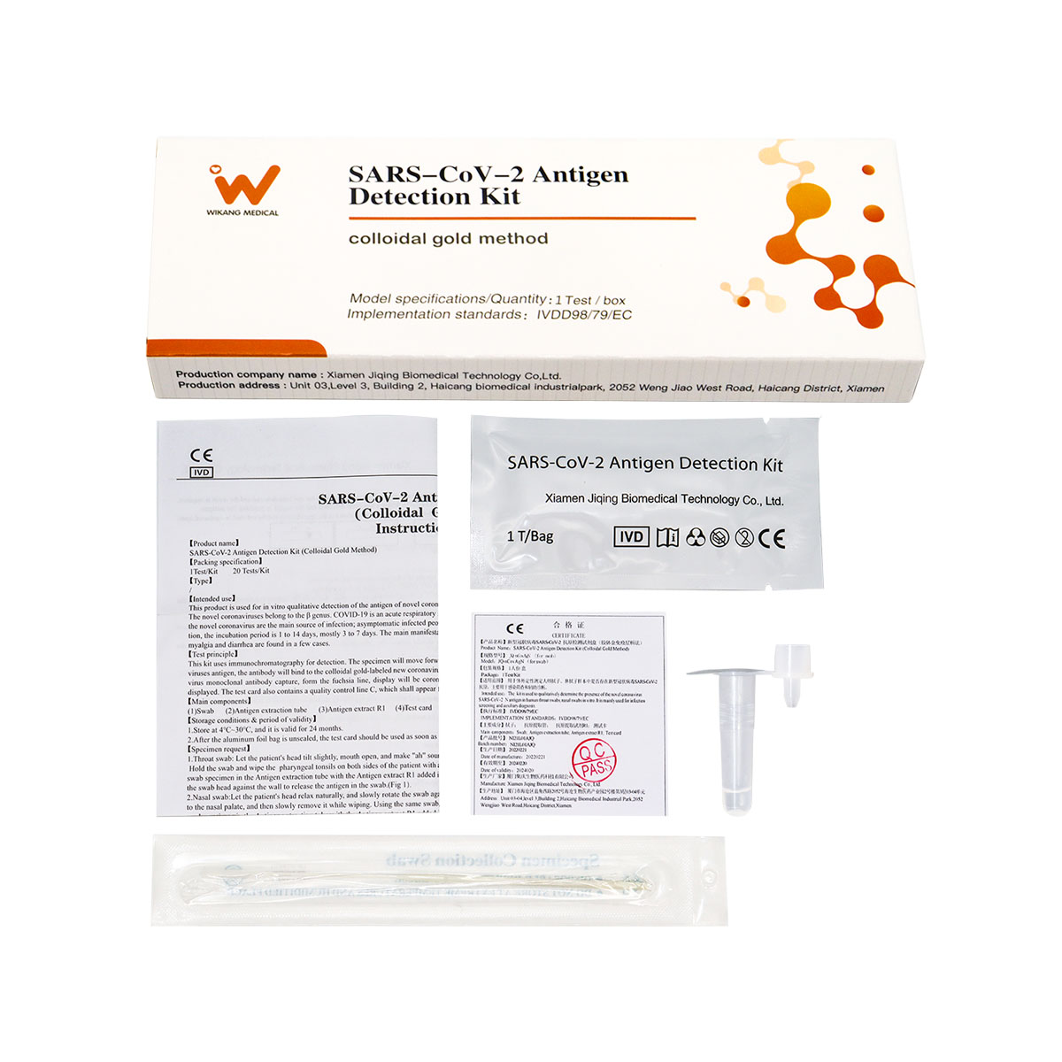 ①咽/鼻拭子②抗原檢測卡③抗原提取管④說明書 |